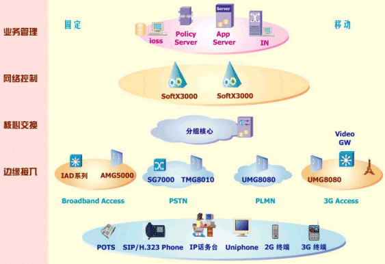 普通用戶可通過智能分組話音終端、多媒體終端接入,通過接入媒體網(wǎng)關(guān)、綜合接入設(shè)備(IAD)來滿足用戶的語音、數(shù)據(jù)和視頻業(yè)務(wù)的共存需求。