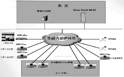 在公司總部安裝一套寬帶視訊交換平臺(tái)ViewPoint 8620及管理系統(tǒng),在公司總部建設(shè)一個(gè)大型視訊會(huì)議室作為主會(huì)場,視訊終端采用ViewPoint 8030mBox。北京另外兩個(gè)小會(huì)議室配置普通視訊終端ViewPoint 8020plus,外地30個(gè)辦事處會(huì)議室各配置一臺(tái)ViewPoint 8020plus視訊終端。2套ViewPoint OpenEye視訊終端安裝于領(lǐng)導(dǎo)桌面,可以用于接入會(huì)議、召集會(huì)議,或者內(nèi)部IP話等。本系統(tǒng)總共包括一臺(tái)ViewPoint8620視訊交換平臺(tái),一臺(tái)ViewPoint 8030mBox視訊終端和32臺(tái)ViewPoint 8020plus視訊終端,兩套領(lǐng)導(dǎo)用桌面終端ViewPointOpenEye。