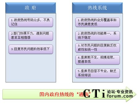 深圳市原有政府熱線所反映的問(wèn)題并非孤立,由于時(shí)代和技術(shù)的局限性,國(guó)內(nèi)其它的一些政府熱線也同樣面臨著諸多問(wèn)題,具體如下: