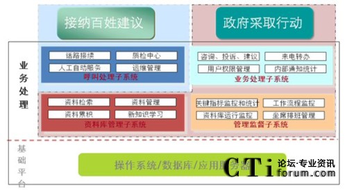 在架構(gòu)設(shè)計(jì)上,從電話接入、辦件流程、資料庫(kù)管理、信息維護(hù)到報(bào)表統(tǒng)計(jì)都實(shí)現(xiàn)了一體化設(shè)計(jì)理念。以業(yè)務(wù)流程設(shè)計(jì)為例,針對(duì)市民來(lái)電中的咨詢(xún)類(lèi)的問(wèn)題,12345政府熱線將直接由前臺(tái)接聽(tīng)人員利用各部門(mén)預(yù)先錄入資料庫(kù)中的規(guī)范答案來(lái)回答市民的提問(wèn);對(duì)市民反映、建議、投訴類(lèi)的來(lái)電,則由前臺(tái)記錄后轉(zhuǎn)給市信訪辦的后臺(tái)工作人員處理。一整套開(kāi)放性的工作流和穩(wěn)定的技術(shù)后臺(tái)支持確保了市民可以在規(guī)定的時(shí)間內(nèi)得到政府的權(quán)威處理與回復(fù)。
