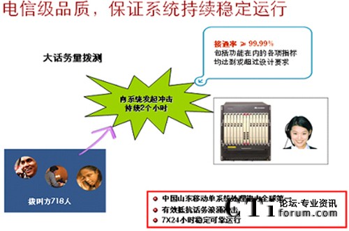 華為聯(lián)絡(luò)中心系統(tǒng)具有高穩(wěn)定性、高可靠性、易擴(kuò)展性和可維護(hù)性。這主要源于華為對(duì)電信網(wǎng)絡(luò)現(xiàn)狀與演進(jìn)的理解,源于華為擁有固定、移動(dòng)和IP三個(gè)網(wǎng)絡(luò)方面綜合實(shí)力。華為數(shù)以千計(jì)的核心平臺(tái)開發(fā)測試人員,幾十種極端環(huán)境(如超大話務(wù)量、溫差、濕度、鹽堿度、缺氧等),磨礪出的是世界級(jí)的高品質(zhì)。麥加朝圣10KM內(nèi)密集200萬移動(dòng)用戶,大部分為國際漫游,整齊劃一的用戶行為,形成連日多波話務(wù)尖峰,網(wǎng)絡(luò)受不均衡沖擊,系統(tǒng)容易雪崩。使用華為方案STC連續(xù)四年征服HAJJ期間話務(wù)高峰,告別系統(tǒng)每逢朝圣就癱瘓歷史。正是繼承了這樣的DNA,我們在某移動(dòng)運(yùn)營商聯(lián)絡(luò)中心系統(tǒng)單點(diǎn)實(shí)測BHCC1200K,每天平均呼叫量為600萬次,一套系統(tǒng)支撐著2000多座席和近8000路IVR。