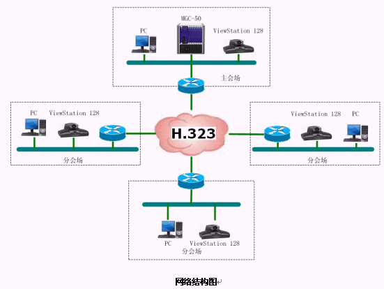 結(jié)合遼寧省消防網(wǎng)絡(luò),本方案設(shè)計(jì)的視頻會(huì)議系統(tǒng)承載在遼寧省消防局的IP網(wǎng)絡(luò)平臺(tái)上,采用國際流行的ITU H.323通信標(biāo)準(zhǔn)。系統(tǒng)采用以MCU為中心輻射各個(gè)會(huì)場(chǎng)電視會(huì)議終端的星型網(wǎng)絡(luò)結(jié)構(gòu)。整套系統(tǒng)由16個(gè)會(huì)場(chǎng)組成,采用美國Polycom公司的ViewStation 128會(huì)議室型終端設(shè)備。網(wǎng)管中心安放一臺(tái)Polycom 公司的MGC-50(多點(diǎn)會(huì)議控制單元),用于對(duì)全網(wǎng)終端的控制,實(shí)現(xiàn)多點(diǎn)、點(diǎn)對(duì)點(diǎn)的會(huì)議。