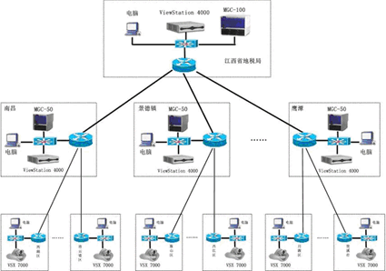 系統(tǒng)的具體設備配置為:在省局配備MGC--100一臺,省局會議室使用POLYCOM公司VSX7000會議終端一臺及VS4000會議終端兩臺;在南昌、景德鎮(zhèn)、九江等11個市局全部配備MGC-50各一臺以及POLYCOM公司VS4000會議終端各一臺,VSX7000會議終端各若干臺(共131臺),從而實現(xiàn)整個視頻會議網(wǎng)絡的多點視頻會議功能。