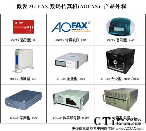 AOFAX系列電腦傳真產(chǎn)品擁有最齊全的型號(hào),包括免費(fèi)使用的AOFAX傳真軟件A10、SOHO/商旅人士便攜使用的AOFAX迷你型數(shù)碼傳真機(jī)A8、單電腦使用的AOFAX普及型數(shù)碼傳真機(jī)A20、4用戶環(huán)境的AOFAX標(biāo)準(zhǔn)型電子傳真機(jī)A30、軍警使用的AOFAX軍用型傳真系統(tǒng)A50、公安專用傳真服務(wù)器A51、營(yíng)運(yùn)版網(wǎng)絡(luò)傳真服務(wù)期A52、不限用戶數(shù)目的AOFAX企業(yè)型網(wǎng)絡(luò)傳真機(jī)A60、1至2線的AOFAX大眾型傳真服務(wù)器A801和A802,2至256傳真線路多種規(guī)格的AOFAX專業(yè)型傳真服務(wù)器A80X、跨區(qū)域大型公司使用的集團(tuán)傳真系統(tǒng)和行業(yè)解決方案等,價(jià)格從幾百到幾十萬(wàn)元,可適應(yīng)各類型客戶的需求,以下為AOFAX全系列產(chǎn)品外觀圖。