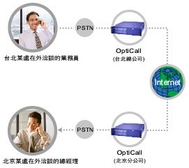有了AltiGen提供的網(wǎng)路電話閘道器,跨國(guó)公司的臺(tái)北業(yè)務(wù)員只要花市內(nèi)電話的費(fèi)用,就可以跟北京出差的總經(jīng)理共商要事,節(jié)省的70 %以上的國(guó)際電話費(fèi)用。通訊流程如下: