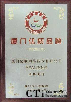 CTI論壇(ctiforum)3月4日消息(記者 潘婷婷): 2011年3月3日,中國最佳IP話機(jī)提供商,暢銷歐美IP通信終端市場(chǎng)—億聯(lián)公司(Yealink)旗下全系列產(chǎn)品近日被廈門市政府授予2010年“廈門市優(yōu)質(zhì)品牌”稱號(hào),為Yealink品牌建設(shè)添上了重要的一筆。