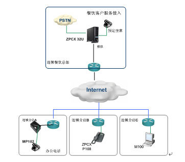 在總部選用ZPCX32U作為系統(tǒng)核心平臺(tái),提供中繼接入和總部辦公電話分機(jī),內(nèi)置IVR等擴(kuò)展功能,作為該企業(yè)統(tǒng)一接入門(mén)戶(hù)和組網(wǎng)核心平臺(tái)。
