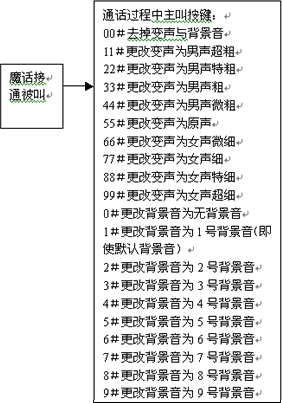 變聲通話功能也叫魔話功能,是指用戶通過通過播打特殊的號碼接入到本平臺(tái)后,再通過本平臺(tái)去呼叫最終的被叫用戶,在這樣的一個(gè)通話過程中,可以通過本平臺(tái)提供8級變聲和原聲功能:“男聲超粗、男聲特粗、男聲粗、男聲微粗、原聲、女聲微細(xì)、女聲細(xì)、女聲特細(xì)、女聲超細(xì)”。在通話過程中實(shí)時(shí)變聲,并可按鍵選擇改變變聲系數(shù)或恢復(fù)原聲,趣味非凡,超常體驗(yàn)。