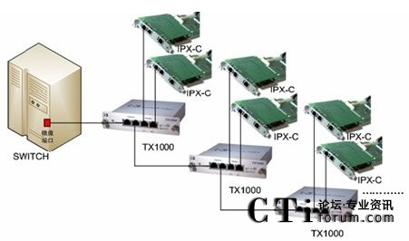 在上圖中,TX1000上Network其中一個端口與交換機鏡像口或Switch設備直接相連,Network的另一個端口與另一個switch相連,該switch下相連好多IP話機。Monitor中的ATx端口與一塊IP錄音板卡相連,另一端口BTx與第二塊IP錄音板卡相連。這樣就做到了IP錄音的冗余備份。