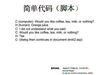 世界上最古老的用戶界面--人類語言終于在二十一世紀借助于VoiceXML,一種語音可擴展標記語言發(fā)展成熟起來。作為世界上第一個真正的語音通信標準,它定義了應用開發(fā)商向用戶提供新型信息訪問服務的方式。通過這種服務,用戶在任何地方,都可以通過電話或任何移動設備,虛擬訪問任何信息。VoiceXML正在被廣泛應用于旅游、金融與信息服務等行業(yè)的各種業(yè)務領域中,甚至是政府部門與市政機構,全球的無線運營商等。