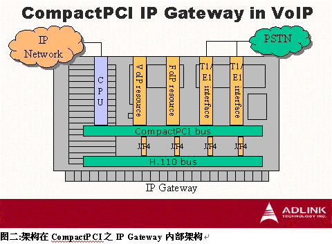 如何實(shí)現(xiàn)如此多功能的IP Gateway如圖二架構(gòu),在CompactPCI標(biāo)準(zhǔn)的背板上,整合了計(jì)算機(jī)電話領(lǐng)域常用的標(biāo)準(zhǔn)H.110 bus,提供冗余時鐘支持熱插拔板卡如VoIP、FoIP、T1/E1