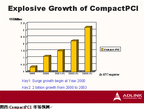 Magazine 估計(jì),CompactPCI市場將由1999年的美金$350 Million成長到2003年的美金$3200 Million,年復(fù)合成長率高達(dá)45.6%,其中又以2002年至2003年最大幅成長。CompactPCI為工業(yè)計(jì)算機(jī)產(chǎn)業(yè)開拓了一個以往傳統(tǒng)工業(yè)計(jì)算機(jī)無法應(yīng)用的新市場,而CompactPCI需針對電信等級應(yīng)用提供高可靠度及達(dá)到嚴(yán)苛高品質(zhì)要求,卻又為傳統(tǒng)工業(yè)計(jì)算機(jī)廠商豎立高進(jìn)入障礙,因此,目前能提供電信級CompactPCI寬頻通訊平臺幾為國外廠商,如Motorola、Ziatech、Force