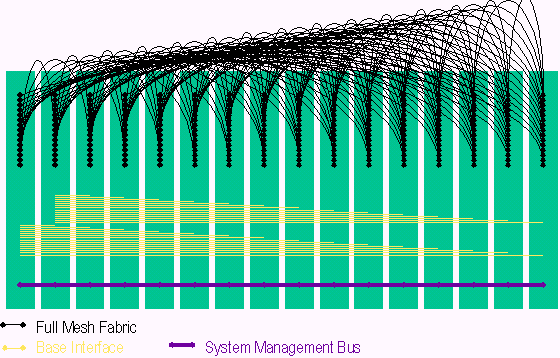 PICMG 3.0包含多種傳輸,這些傳輸模式如圖由下而上依序提供系統(tǒng)管理層、控制層、資料層等的聯(lián)接。系統(tǒng)管理是基于一條與各槽位都相連的I2C 雙串行信號(hào)線, 系統(tǒng)管理信息則是基于IPMI規(guī)范被擴(kuò)展到在PICMG3.0規(guī)范中使用。系統(tǒng)管理總線也是冗余方式確保在一條總線故障情況下,管理信息仍正常傳遞。在資料層旁邊的控制層稱作Base 接口 (Base Interface),Base接口是一個(gè)雙星型的拓?fù)浣Y(jié)構(gòu)具有冗余的交換刀片和以太網(wǎng)BAST-T信號(hào),在PICMG 3.0中提供IP傳輸,這點(diǎn)在架構(gòu)定義上非常像PICMG 2.16。PICMG 3.0單板的高速數(shù)據(jù)傳輸是通過Fabric接口 (Fabric Interface),F(xiàn)abric接口是基于3.125Gbps SERDES信號(hào),可以在星型和全網(wǎng)狀結(jié)構(gòu)中支持10Gb的傳輸速率。正如上面提到的,PICMG 3.0核心規(guī)范定義了Fabric接口的信號(hào)和互聯(lián),而輔助規(guī)范定義了用于傳輸?shù)膮f(xié)議。PICMG 3.0 背板的互聯(lián)支持全網(wǎng)狀Fabric接口,雙星型Base接口和冗余的系統(tǒng)管理,如下圖所示: