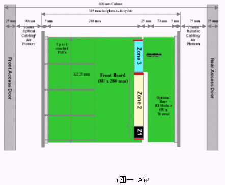 我們可以看到當(dāng)今市面上已有相關(guān)的零件商或系統(tǒng)商開(kāi)發(fā)出14U或13U,12U的ATCA機(jī)箱。就ATCA機(jī)箱的型式來(lái)說(shuō)可以分為直立型插卡與橫向型插卡兩種類型。直立式插卡機(jī)箱的標(biāo)準(zhǔn)為14槽(參考圖一B),而橫向型機(jī)箱因受限于機(jī)箱高度,所以視其高度決定槽數(shù)的多少。 ATCA的架構(gòu)主要包括以下部分:正面插槽,RTM,PEM,背板,CMMs,散熱系統(tǒng)。(參考圖一與圖二)