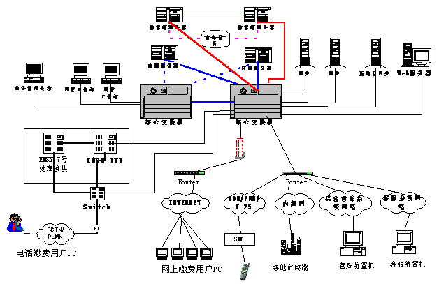 根據(jù)公司業(yè)務(wù)系統(tǒng)的組網(wǎng)方式,提供合適的解決方案,滿足需求,采用全省集中方式,具有以下特點(diǎn):省中心建設(shè)語(yǔ)音處理系統(tǒng)和付費(fèi)平臺(tái)業(yè)務(wù)系統(tǒng)集中在省中心;完全集中管理;完全支持全省漫游繳費(fèi);全省設(shè)備投資較少。