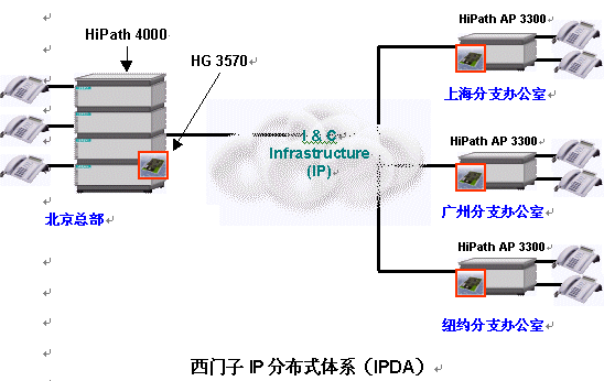 IP分布式體系(IPDA)建于西門子HiPath通信平臺(tái)之上,它能解決您的上述煩惱。在各分支辦公室部署HiPath接入點(diǎn)(Access Point)后,同時(shí)在集成IP網(wǎng)關(guān)HiPath HG 3500家族的幫助下,HiPath能夠建立起一個(gè)將所有分支辦公室包括在內(nèi)的IP通信網(wǎng)絡(luò)。