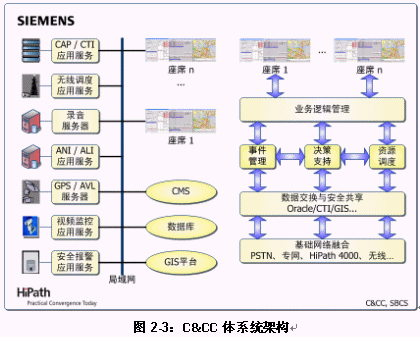 C&CC是西門子指揮控制中心全面解決方案的核心。C&CC以有線(HiPath 4000)/無線(模擬和數(shù)字集群)通訊平臺為信息采集和資源調(diào)度基礎(chǔ),系統(tǒng)核心模塊包括:融合多種業(yè)務(wù)的接處警工作流,面向地理信息對象的資源管理,面向事件的案情與錄音管理,基于預(yù)案的輔助決策支持,以及多種統(tǒng)計(jì)、查詢和報(bào)表生成工具等。在此基礎(chǔ)上,C&CC還提供豐富的接口,確保與技防報(bào)警、圖像/視頻監(jiān)控和GPS