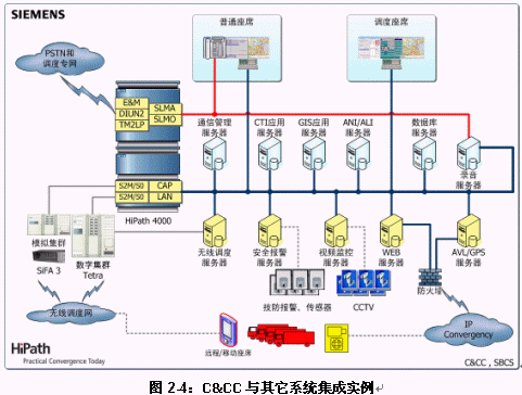 錯(cuò)誤!未找到引用源。是關(guān)于C&CC最一般的系統(tǒng)集成實(shí)例。從圖中不難看出:C&CC對其它子系統(tǒng)提供了豐富的接口以保證系統(tǒng)與系統(tǒng)之間的互通、互連,而且是這些接口都是標(biāo)準(zhǔn)化的。作為面向公安"三警合一"的標(biāo)準(zhǔn)化的解決方案,C&CC的設(shè)計(jì)根本目標(biāo)是提供盡可能豐富而標(biāo)準(zhǔn)化的功能與接口以壓縮系統(tǒng)部署周期,這個(gè)目標(biāo)實(shí)際上是與經(jīng)費(fèi)相對受限制用戶的利益是一致的。
