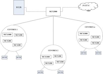 MCX2000支持連接多個(gè)屬于不同企業(yè)的MCX200/1000,能夠把同一個(gè)企業(yè)的不同MCX200/1000集中組成IP CENTREX群,支持群內(nèi)呼叫、群外呼入、群外呼出等功能,使用戶感覺不到多個(gè)MCX200的存在,如同所有的用戶在同一個(gè)交換設(shè)備內(nèi)。MCX2000同時(shí)支持多個(gè)IP