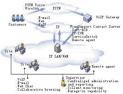 FineSupport發(fā)揮了軟交換和VoIP技術(shù)的優(yōu)勢,并融合了Internet的特性,使顧客與呼叫中心之間不僅可以通過語音進(jìn)行通信,還可以通過電子郵件、傳真、文字交談進(jìn)行通信,甚至可以實現(xiàn)在線推送網(wǎng)頁、在線網(wǎng)頁導(dǎo)航等業(yè)務(wù)。呼叫中心的客服人員只需具備一臺多媒體電腦和一副耳麥,即可向顧客提供完備的服務(wù)。