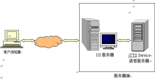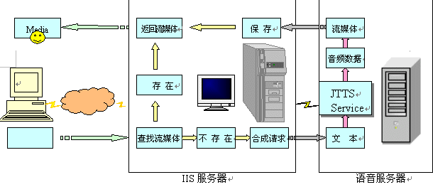 語音服務(wù)器方案是指利用捷通華聲在CTI領(lǐng)域成熟應(yīng)用的jTTS Service語音服務(wù)器,增加一臺或多臺語音服務(wù)器到現(xiàn)有的IIS服務(wù)系統(tǒng)的網(wǎng)絡(luò)環(huán)境中;在IIS服務(wù)器中,增加訪問語音服務(wù)器的功能。當IIS服務(wù)器需要流媒體輸出時,向語音服務(wù)器發(fā)出請求,語音服務(wù)器接受IIS服務(wù)器的請求,并對請求的數(shù)據(jù)進行合成、格式轉(zhuǎn)換,得到流媒體后返回給IIS服務(wù)器,IIS服務(wù)器再將此流媒體傳輸給用戶。