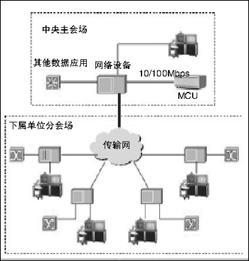 各節(jié)點的接入采用一條512Kbps帶寬的DDN/E1線路接入本地電信公司;在總部采用集中式接入中央電信公司,接入中心的電路帶寬應(yīng)該是多條信道捆綁的帶寬,中心節(jié)點交換機采用10/100Mbps與MCU相連,總部主會場的視頻終端通過接入交換機與MCU進(jìn)行通信。