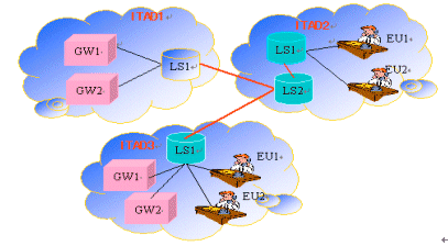 管理域就成了一個虛擬的IP電話網(wǎng)關(guān)提供者了,因為它提供了網(wǎng)關(guān)服務,但是它自己實際又沒有網(wǎng)關(guān)和管理任何網(wǎng)關(guān)。一個IT管理域也可以沒有端用戶,這時它可以提供"批發(fā)"網(wǎng)關(guān)的服務,為其他ITAD里的顧客提供網(wǎng)關(guān)服務;一個IT管理域可以既沒有網(wǎng)關(guān)也沒有端用戶,只有LS,在這種情況下,ITAD充當一個批發(fā)商(Reseller),獲取其它域的網(wǎng)關(guān)信息,而且收集和傳播這些信息對其它有用戶的ITAD。