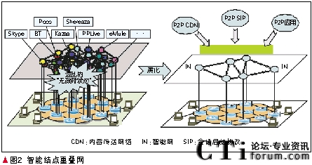 智能節(jié)點(diǎn)重疊網(wǎng)是覆蓋在IP核心網(wǎng)上的傳統(tǒng)的彈性重疊網(wǎng)(RON)技術(shù)與分布式哈希表(DHT)技術(shù)相結(jié)合的新型重疊網(wǎng)技術(shù),包括自動(dòng)組網(wǎng)、網(wǎng)絡(luò)資源管理、路由優(yōu)化等關(guān)鍵技術(shù)。其基本結(jié)構(gòu)是保持TCP/IP協(xié)議不變,原來的3層變成3-層,在其上建立一個(gè)智能結(jié)點(diǎn)重疊網(wǎng)做為3+層,在此分布式管理平臺上提供流量監(jiān)控、流量控制、QoS、病毒防止和安全性等服務(wù)。智能結(jié)點(diǎn)重疊網(wǎng)的另外一個(gè)任務(wù)是為各種P2P應(yīng)用提供支撐環(huán)境。它可以為在互聯(lián)網(wǎng)上采用不同協(xié)議和軟件的各種P2P業(yè)務(wù),提供統(tǒng)一的支撐環(huán)境。主要是提供P2P CDN和P2P SIP。智能結(jié)點(diǎn)重疊網(wǎng)如圖2所示。