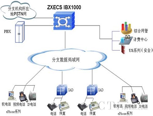 同時在各分支結(jié)構(gòu),可通過中興通訊ZXECS IBX1000綜合媒體網(wǎng)關(guān)提供到各地PSTN的語音落地,實(shí)現(xiàn)與各地PSTN的互通。