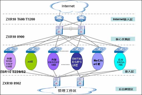 寬帶數(shù)據(jù)承載網(wǎng)主要考慮的是保證網(wǎng)絡(luò)的高可靠性(整體網(wǎng)絡(luò)結(jié)構(gòu)全冗余和設(shè)備的全冗余配置)、高可擴(kuò)展性(核心交換設(shè)備具有大容量特性和網(wǎng)絡(luò)結(jié)構(gòu)的易于拓展)、分層網(wǎng)絡(luò)結(jié)構(gòu)和高可用性。中興的解決方案中,整個網(wǎng)絡(luò)分成四個部分:Internet接入層、核心交換層、接入層、后臺管理區(qū)。