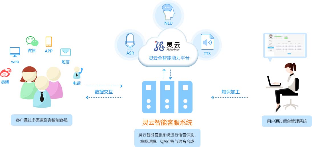 客戶通過(guò)電話、微信、網(wǎng)頁(yè)等多種渠道咨詢智能客服,靈云全智能客服系統(tǒng)進(jìn)行語(yǔ)音識(shí)別、意圖理解、QA問(wèn)答與語(yǔ)音合成,企業(yè)通過(guò)后臺(tái)管理智能客服系統(tǒng)。
