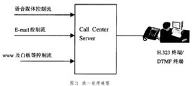 目前,IP Call Center實現(xiàn)綜合媒體統(tǒng)一處理的方式已取得比較一致觀點,即如圖3的語音媒體流和IP傳真、Web主頁、Email進入座席群前先經(jīng)過一個服務(wù)軟件進行統(tǒng)一處理,該服務(wù)軟件一般廠家都稱為Call Center Server(簡稱CCS服務(wù)器),它起著完成呼叫控制、路由處理、與呼叫同步的用戶數(shù)據(jù)管理及信息監(jiān)視等作用。