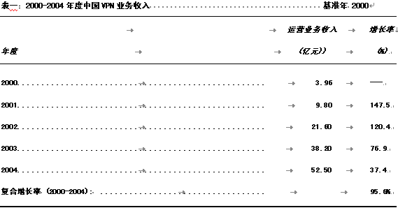 2000年,中國(guó)VPN運(yùn)營(yíng)業(yè)務(wù)收入為人民幣3.96億元,主要業(yè)務(wù)提供商為新興的電信運(yùn)營(yíng)商如網(wǎng)通、吉通、聯(lián)通等公司,以及數(shù)量可觀的或明或暗的網(wǎng)絡(luò)公司,VPN用戶主要集中在規(guī)模較大的外企、金融領(lǐng)域以及與IT相關(guān)的企業(yè)之中。隨著更多的虛擬運(yùn)營(yíng)商進(jìn)入VPN服務(wù)市場(chǎng),以及企業(yè)成本意識(shí)的不斷增強(qiáng),VPN用戶群體已經(jīng)呈擴(kuò)散之勢(shì),制造業(yè)、FMCG連鎖經(jīng)營(yíng)業(yè)、酒店業(yè)等已經(jīng)迅速進(jìn)入這一市場(chǎng)。預(yù)計(jì)到2004年度,國(guó)內(nèi)VPN業(yè)務(wù)收入可以達(dá)到52.5億元人民幣,年復(fù)合增長(zhǎng)率為95.6%。各年度測(cè)算數(shù)據(jù)見表一。