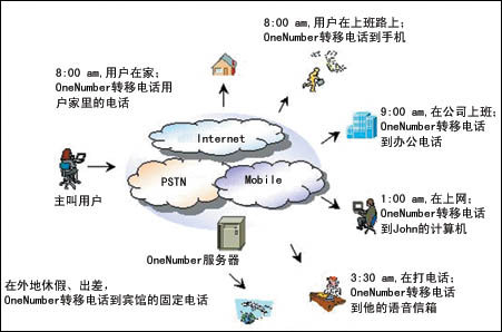 通過(guò)OneNumber這一業(yè)務(wù)系統(tǒng),電信運(yùn)營(yíng)商可以整合用戶(hù)的各種號(hào)碼資源,有效留住客戶(hù);用戶(hù)只需申請(qǐng)一個(gè)OneNumber號(hào)碼,無(wú)論用戶(hù)走到哪里,主叫用戶(hù)都可以通過(guò)電話、手機(jī)、PC等方式撥打該號(hào)碼聯(lián)系到用戶(hù)。用戶(hù)接受信息的手段可以根據(jù)自己的設(shè)定,以電話、手機(jī)、短信、PC等方式與主叫用戶(hù)建立聯(lián)系,也可以語(yǔ)音信箱的方式收聽(tīng)留言。
