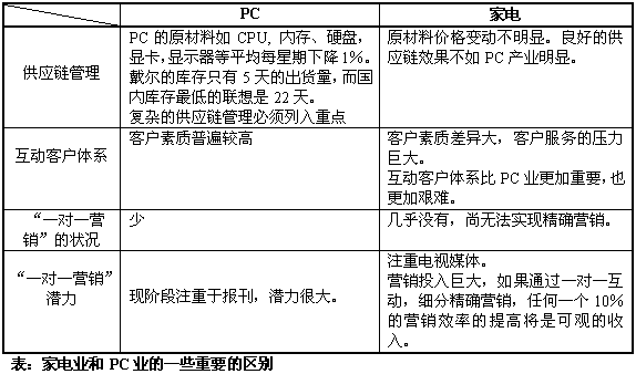 聯(lián)想長期構(gòu)筑的、在中國PC制造業(yè)的核心競爭力,正受到戴爾的巨大威脅,導(dǎo)致聯(lián)想開始轉(zhuǎn)而采用戴爾的按客戶需求定制、直接銷售的模式,希望建立新的核心競爭力,再度引領(lǐng)中國PC產(chǎn)業(yè)。IT制造業(yè)的巨變,戴爾的成功給陷于低層次競爭的家電產(chǎn)業(yè)很大的啟發(fā),曾經(jīng)鑄造中國家電企業(yè)輝煌的核心競爭力急需注入新的生命力,以適應(yīng)新的競爭形勢。計算機(jī)技術(shù)、互動通信技術(shù)的進(jìn)步以及互聯(lián)網(wǎng)的出現(xiàn)使企業(yè)能夠建立與用戶之間一對一的密切客戶關(guān)系,使服務(wù)創(chuàng)造價值,IT技術(shù)推動技術(shù)、產(chǎn)品、生產(chǎn)、銷售和營銷的發(fā)展,支撐家電企業(yè)建立新的核心競爭力。在同質(zhì)化競爭的環(huán)境下,家電企業(yè)也許更應(yīng)該從服務(wù)、營銷、銷售方面來建立自己的核心競爭力。海爾就是典型的例子,海爾的發(fā)展與它完善的服務(wù)體系和服務(wù)制度是分不開的。聚焦于服務(wù)、營銷、銷售的客戶關(guān)系管理(CRM)系統(tǒng)讓家電企業(yè)看到了新的希望?梢灶A(yù)言,CRM將為家電業(yè)點(diǎn)燃一盞新啟航燈。