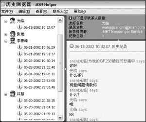 MSN Helper啟動時會自動啟動MSN,可以看到在MSN的菜單欄上多了一個“助手”菜單。在這里“打開歷史瀏覽器”,就可以輕松地查看聊天記錄啦(如圖1)。如果覺得某些聊天的內(nèi)容比較重要,在右邊的記錄窗口里拖選中這些記錄,然后單擊“文件”菜單,將聊天記錄保存或打印出來。