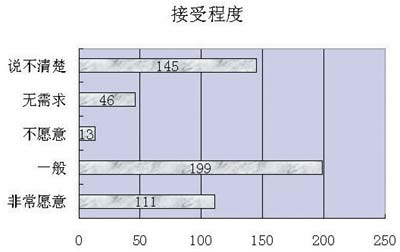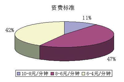 在調查中,67.4%的用戶對現(xiàn)有中國電信的資費標準(10元/分鐘)表示不滿,32.6%的用戶表示滿意。但同時58%的用戶對能接受的資費標準上又選擇了居中和較高的資費標準,表明用戶對視訊應用產品的價格承受能力較高。