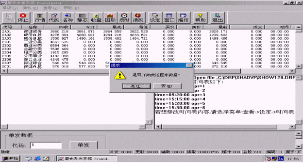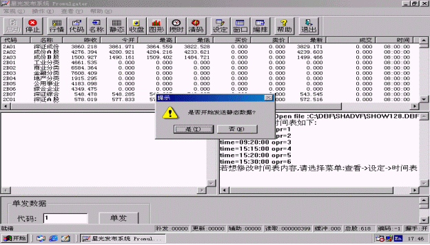 選擇該功能,系統(tǒng)會(huì)自動(dòng)發(fā)送所有指數(shù)和股票的歷史圖形。歷史圖形發(fā)送用時(shí)較長,一般要用一個(gè)小時(shí)左右,它中間的延時(shí)要由信息發(fā)布時(shí)間間隔來定,信息發(fā)布時(shí)間間隔越大,耗時(shí)越長。