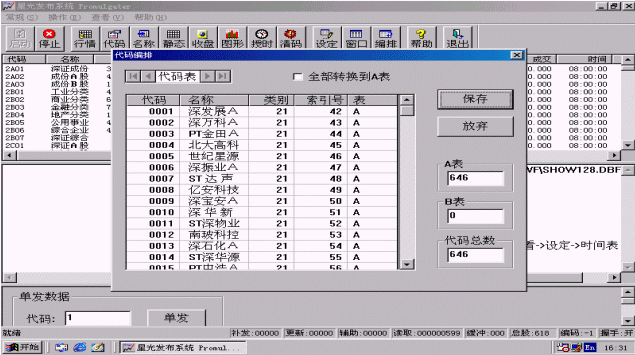 注意:股票機(jī)器要求必須把記錄的索引放在A表或者B表。A表或B表中如果有任何一項(xiàng)數(shù)據(jù)改動(dòng)過(添加、刪除或修改),整個(gè)A表或B表的代碼都需重新發(fā)送。因此,我們建議把股票代碼分開存放在A、B兩個(gè)表,A表存放不改變的代碼,大部分已發(fā)行的代碼可以認(rèn)為是不會(huì)改變了。一旦有新代碼出現(xiàn),我們把它存放在B表中,這樣,只需重發(fā)B表就可以了,而A表中的代碼因?yàn)闆]有改變,因此就不必重新發(fā)送了,從而大大的節(jié)約了發(fā)送時(shí)間。如果有新股上市,它就會(huì)自動(dòng)添加到B表。