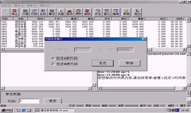 選擇<代碼>按鈕進(jìn)行證券代碼發(fā)布,系統(tǒng)自動(dòng)彈出<代碼發(fā)送窗口>,如圖3.3