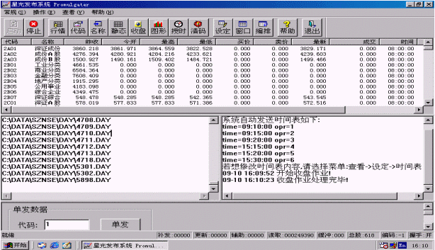 中匯金融信息臺(tái)股票信息發(fā)布系統(tǒng)是中匯金融信息臺(tái)同星傳通信科技(深圳)有限公司共同開發(fā)研制的新一代高速股票信息發(fā)布系統(tǒng),它配合中匯金融信息臺(tái)現(xiàn)行使用的星光產(chǎn)SP658、SP659、SP688高速股票機(jī),實(shí)現(xiàn)深、滬兩市證券交易行情的實(shí)時(shí)發(fā)布,刷新速度最快可達(dá)20秒/遍,是目前全國刷新速度最快的尋呼股票發(fā)布系統(tǒng)之一。該系統(tǒng)兼顧多種信息源輸入格式,配置靈活,采用最為普及和成熟的POCSAG尋呼編碼技術(shù),最大限度地為用戶節(jié)約運(yùn)營成本。該發(fā)布系統(tǒng)集信息源接收和信息發(fā)布于一臺(tái)PC機(jī)中,一邊接收?qǐng)D文電視的股票數(shù)據(jù),一邊整理發(fā)送到編碼器,不但節(jié)約了電腦設(shè)備,而且避免了信息上網(wǎng)交換帶來的延遲,不愧為一種經(jīng)濟(jì)快捷的發(fā)送方式。