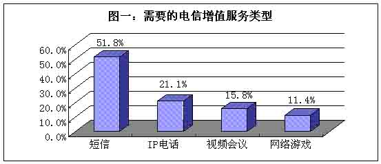 當用戶被問到“最需要的電信增值服務(wù)是什么?”,在短信、IP電話、視頻會議和網(wǎng)絡(luò)游戲這四個備選項當中,超過一半的被訪者選擇短信;其次是IP電話,選擇此項的被訪者占據(jù)21%;再是視頻會議,選擇此類多媒體通訊方式的被訪者約占16%;最后是網(wǎng)絡(luò)游戲,需要此類增值服務(wù)的人約為10%。(見圖一)