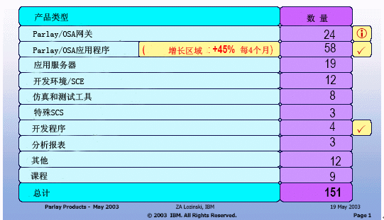 2003年5月底,世界上已經(jīng)有45個業(yè)務(wù)提供商正在使用Parlay 3.0或正準(zhǔn)備采用Parlay技術(shù)。