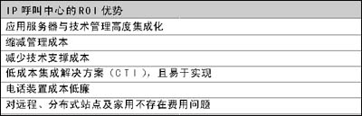 為盡量縮減成本,企業(yè)主管們都在想方設(shè)法引入新型通信技術(shù)改造呼叫中心。IP呼叫中心的ROI優(yōu)勢在于:應(yīng)用服務(wù)器與技術(shù)管理高度集成化;縮減管理成本;減少技術(shù)支撐成本;低成本集成解決方案(CTI),且易于實(shí)現(xiàn);電話裝置成本低廉;對遠(yuǎn)程、分布式站點(diǎn)及家用不存在費(fèi)用問題。
