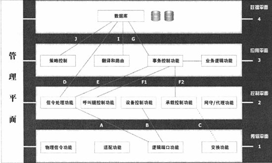 控制平面處于第二層,提供控制功能,如信令處理、承載連接控制、設(shè)備控制、呼叫腿(Leg)控制、網(wǎng)守(Gatekeeper)和代理信令等功能。其中:參考點(diǎn)D位于信令處理功能和數(shù)據(jù)庫功能之間,采用TCAP信令;參考點(diǎn)E在信令處理功能和會話控制功能之間,采用TCAP信令,用于IN請求等傳送,業(yè)務(wù)邏輯對呼叫的控制等消息傳送;參考點(diǎn)F1、F2分別采用呼叫控制API和承載連接控制API,如TAPI、JTAPI等?刂破矫媾c外界的接口2采用H.323(H.225/H.245)、SIP、TCAP(TCAP/SCCP/M3UA/SCTP/IP)等協(xié)議和信令。