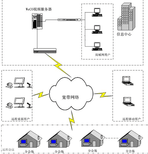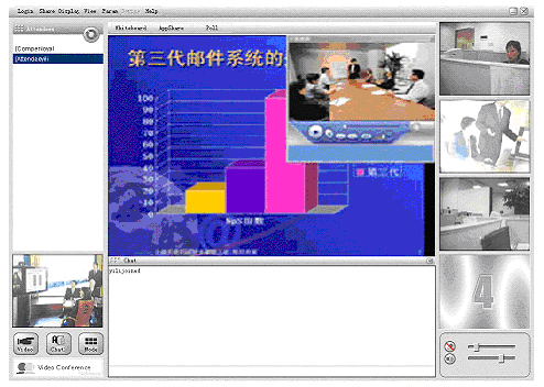 計(jì)算機(jī)、網(wǎng)絡(luò)技術(shù)高速發(fā)展的今天,傳統(tǒng)的通訊方式日益滿足不了人們的要求。人們要求能進(jìn)行遠(yuǎn)程會(huì)議,開(kāi)展面對(duì)面的交流;同時(shí),在滿足傳統(tǒng)視頻會(huì)議音/視頻通信的基本要求之外,現(xiàn)代會(huì)議更希望能夠提供更加豐富多樣的會(huì)議討論形式和功能,比如:遠(yuǎn)程開(kāi)展季度/年度預(yù)算及工作計(jì)劃的討論,需要遠(yuǎn)程共享PPT等演示文檔和EXCEL等表格,需要共同就某一網(wǎng)上信息開(kāi)展討論,甚至能夠?qū)㈤_(kāi)會(huì)的通知通過(guò)電子郵件和手機(jī)短消息的方式傳達(dá)到每一個(gè)與會(huì)者那里。