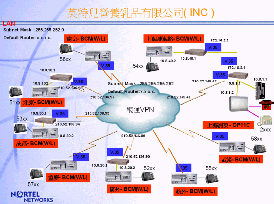 此系統(tǒng)的VPN線路由中國網(wǎng)通公司提供,INC上海浦東生產(chǎn)基地為主點(Nortel OP11C)系統(tǒng)通過ITG(Internet Telephone