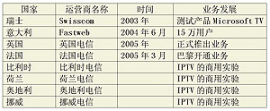 歐洲電信運(yùn)營商在部署IPTV時(shí),主要采用三重服務(wù)(triple-play)業(yè)務(wù)模式占領(lǐng)市場(chǎng)。該業(yè)務(wù)模式有助于電信運(yùn)營商與有線電視運(yùn)營商的競爭。目前,歐洲電信運(yùn)營商已準(zhǔn)備或開始IPTV的商業(yè)化進(jìn)程。