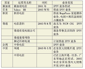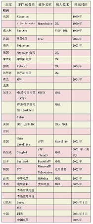 1999年,英國Video Networks公司率先在全球推出了IPTV業(yè)務(wù),此后,國外許多電信運(yùn)營商先后進(jìn)入IPTV市場(chǎng)。但在2004年之前,多數(shù)運(yùn)營商僅側(cè)重于IPTV的試驗(yàn),2004年后,IPTV開始從試驗(yàn)階段向商用階段轉(zhuǎn)變,許多業(yè)界人士認(rèn)為,2005年將成為IPTV年。