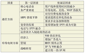 IPTV市場(chǎng)發(fā)展的驅(qū)動(dòng)力主要有兩個(gè)方面:一是通信方面的因素,二是有線電視方面的因素(詳見表4)。